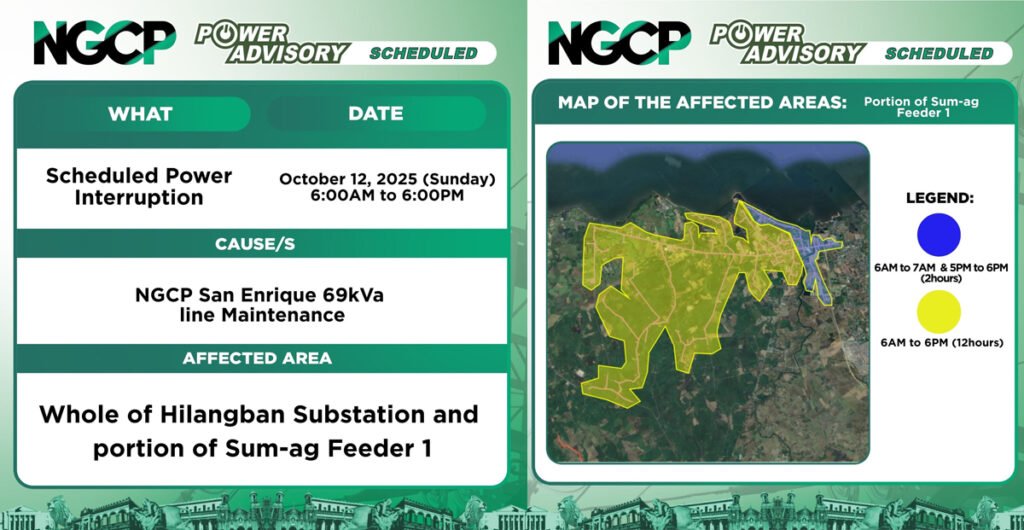 The scheduled power outage will affect the Sum-ag and Hilangban substations under the franchise area of Negros Power, as well as the Valladolid, San Enrique, and La Carlota substations of the Negros Occidental Electric Cooperative.