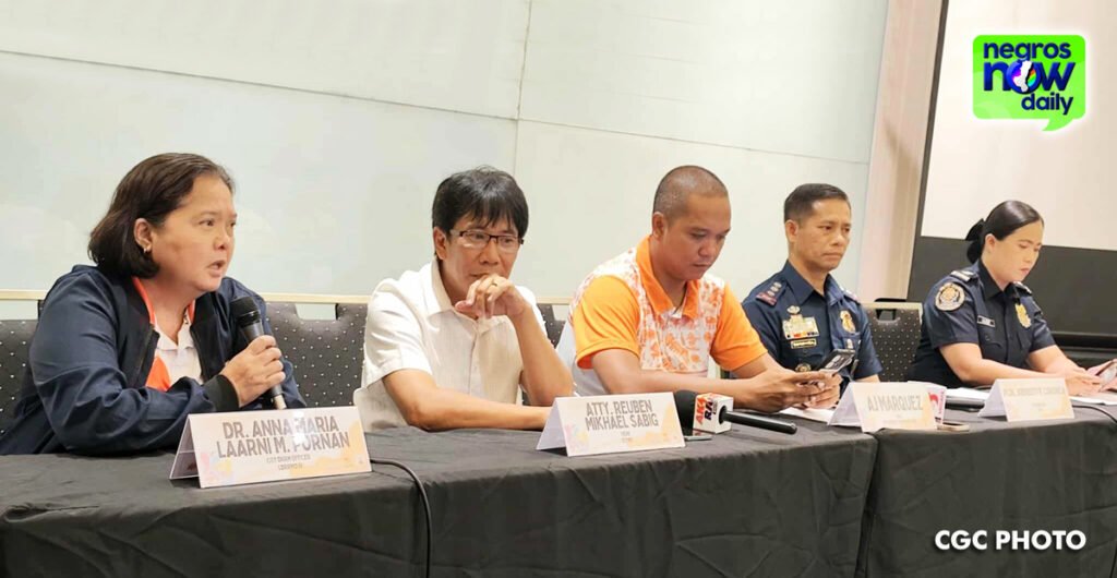 From left, Dr. Anna Maria Laarni Pornan, head of the City Disaster Risk Reduction and Management Office; Atty. Reuben Mikhael Sabig of the Bacolod Traffic and Transport Management Department; AJ Marquez, BGFI Interagency Department head, P/Col. Joeresty Coronica, director of the Bacolod City Police Office; and F/Supt. Jenny Mae Masip, Bacolod Fire Station marshal, discuss MassKara Festival updates at the press conference Sept. 24. | CGC photo