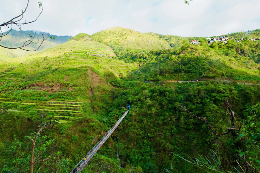 Our bags and supplies are sent up by zip line. We hike down one mountain, cross a long, narrow suspension bridge that visibly swings with each step, and then climb back up steep dirt paths and concrete stairs. The bridge is just wide enough for one person. The planks shift beneath your feet. The drop below is far enough that fear becomes audible—screams from people ahead echo across the valley.