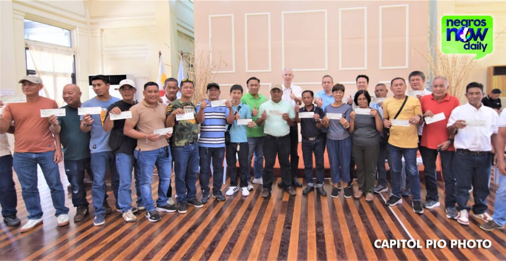 Negros Occidental Governor Eugenio Jose Lacson, Vice Gov. Joeben Alonso, and board members Andrew Montelibano, Jeffrey Tubola, Bambi Depasucat, Hadji Trojillo, Richard Sablan, and Genaro Alvarez IV led the ceremonial distribution of checks at the Capitol Social Hall in Bacolod City. ||